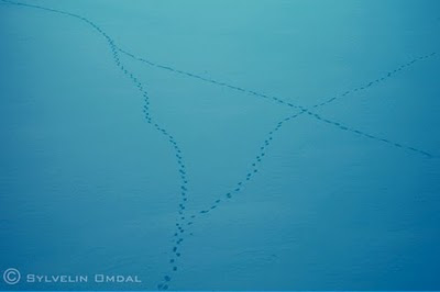 ...er det ikke rart hvordan vi kan oppdage ting når vi forandrer betraktnings sted, enten vi tar oss et par skritt tilbake eller som her står oppe på en bro.Hadde jeg stått nede på isen her så ville jeg ikke sett det artige mønsteret til sporene i snøen. Veier som møtes og veier som skilles, uten egentlig noe særlig plan. Det bare blir slik, og bildet det danner seg når du tar deg et par skritt tilbake og betrakter helheten...