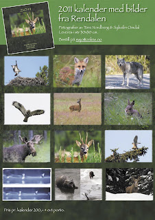 Jeg har laget en kalender for 2011 med fine bilder fra Rendalen. Det er noen av mine bilder og noen bilder av Tore Nordberg. Kalenderen har bl.a et meget spesielt bilde av ulv, og artig bilde av rev og oter. Når man ser på bildet av ulven, kan man forstå hvorfor ulvespor i snøen er store. Det er noen virkelig store poter den har!! Jeg selger kalenderen for kr 200,- pluss evt porto. Kalenderen er i størrelse 30x30cm med spiraloppheng og meget god papirkvalitet. Den kan bestilles ved å sende meg en mail på swjo@online.no Så hvis du har lyst på en flott kalender med naturfoto til å holde styr på tida i 2011, vel da har jeg det til deg!!